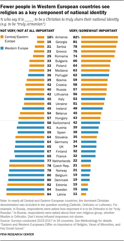 Una razón para la mentalidad generalmente xenófoba, machista y conservadora imperante en los países del Este es la influencia todavía muy grande de la religión: tanto católica, como ortodoxa, como protestante. En todo el área el proceso de secularización está mucho menos avanzado que en Europa occidental por diversas razones. Para empezar porque la trayectoria histórica ha sido muy diferente, por ejemplo en países como Polonia la Iglesia articuló la resistencia nacional contra el régimen "ateo" de la URSS. Por su parte el Ejército en última instancia es visto en muchos países de la zona como el último bastión de defensa ante el peligro ruso. Por ello ambas instituciones gozan en general del prestigio de verse asociadas con la idea de democracia.